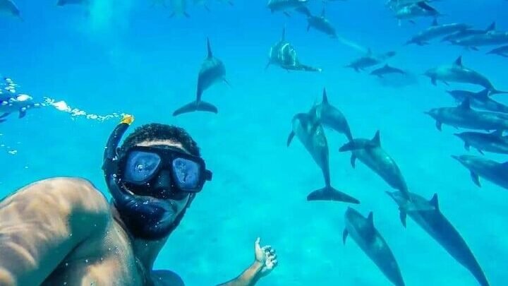 Dolphin House (Shaab El Erg) is one of Egypt’s most famous snorkeling spots where wild spinner dolphins gather every morning. Witnessing hundreds of playful dolphins in their natural habitat is a life-changing experience that draws travelers from around the globe.